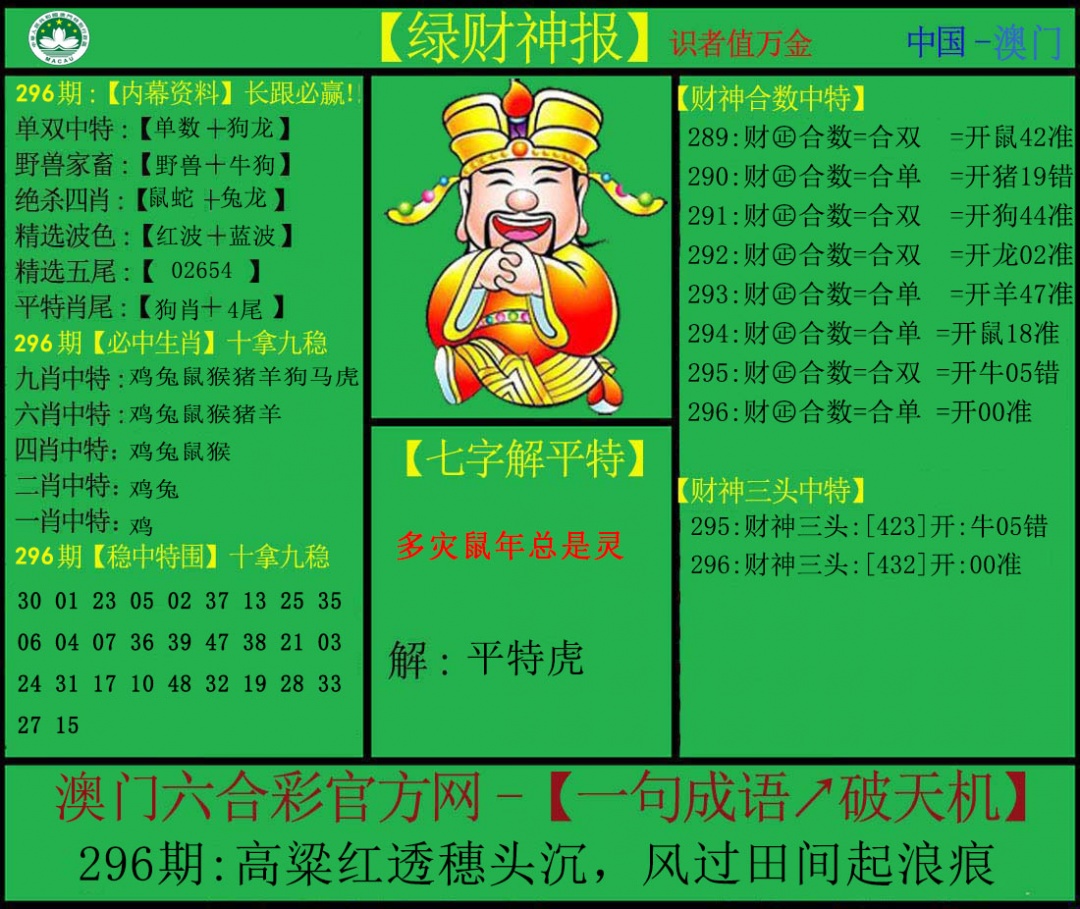 296期:澳门六合彩彩圖信封【绿财神报】每期自动更新