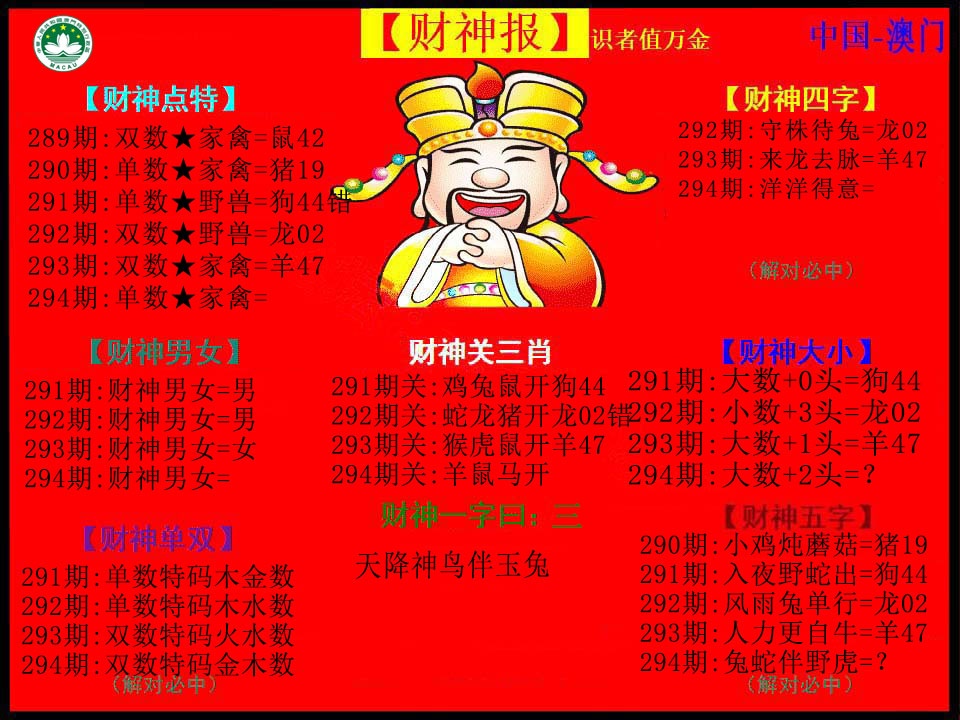 294期: 澳门六合彩彩圖信封【黄财神报】每期自动更新